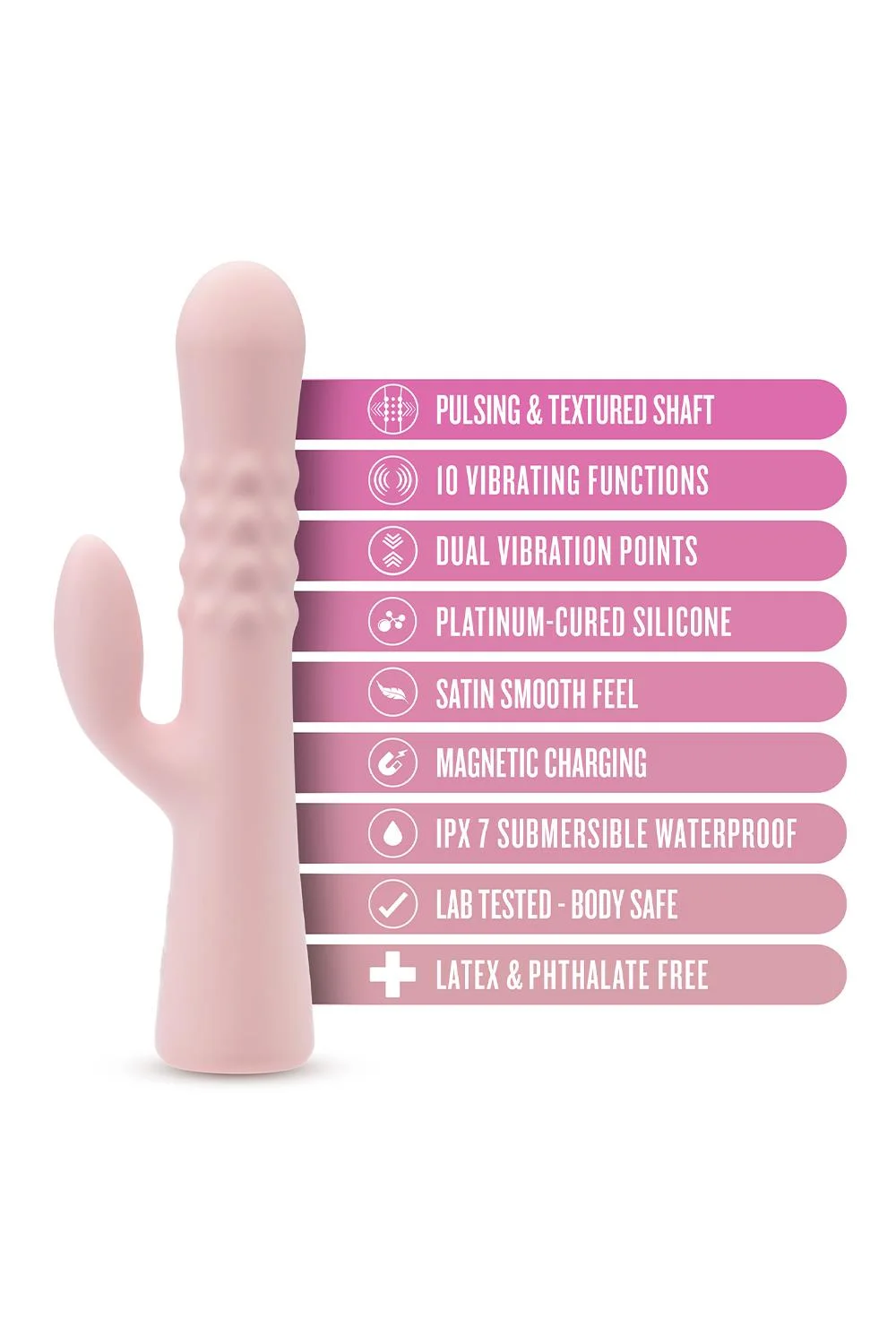 - 10 zmysłowych trybów wibracji z teksturowanym, pulsującym trzonem, który rozszerza się dla wewnętrznej przyjemności