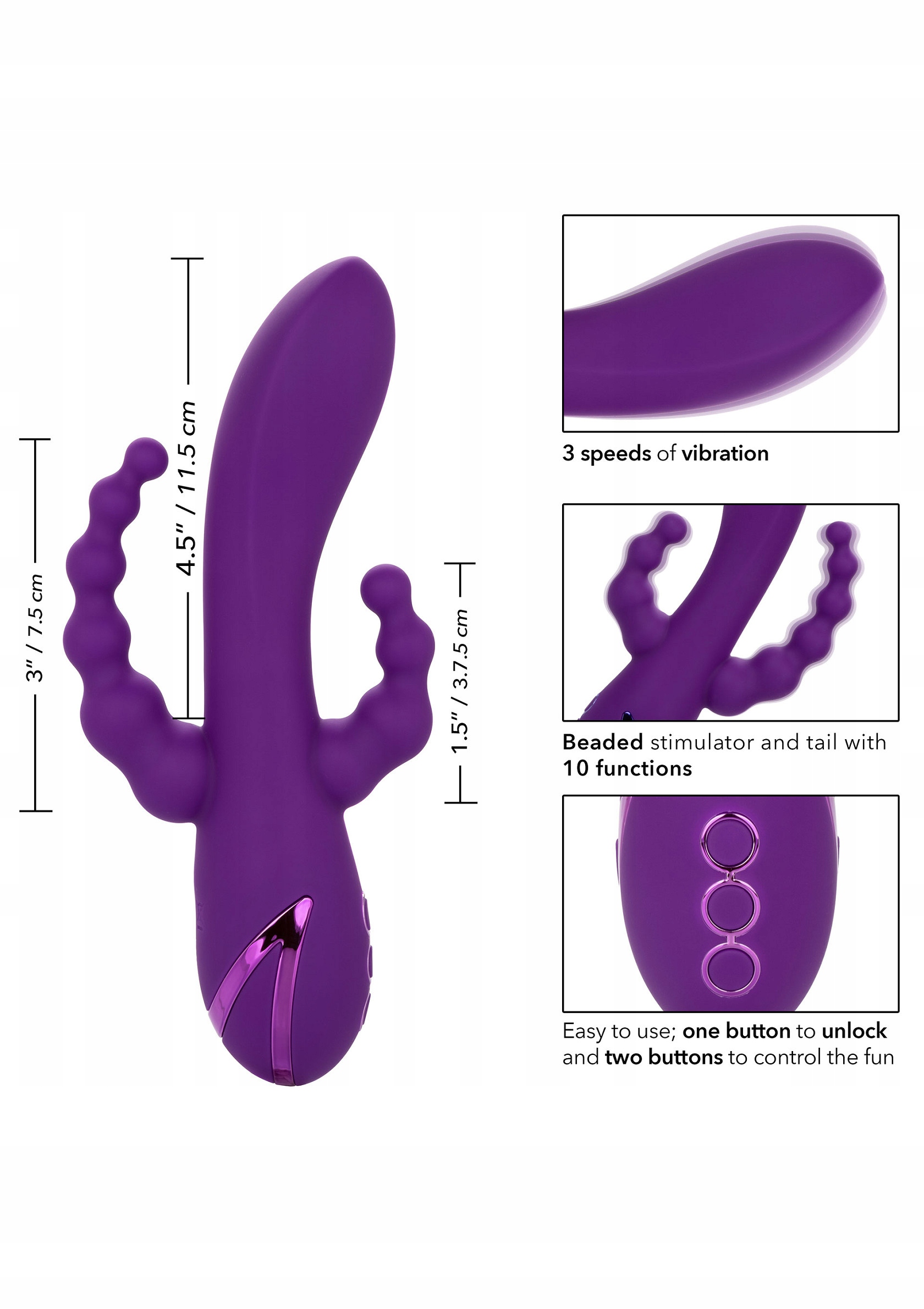 Doświadcz przyjemności jak nigdy dotąd dzięki potężnemu masażerowi o potrójnym działaniu z wibrującym trzonem, ogonem i stymulatorem.