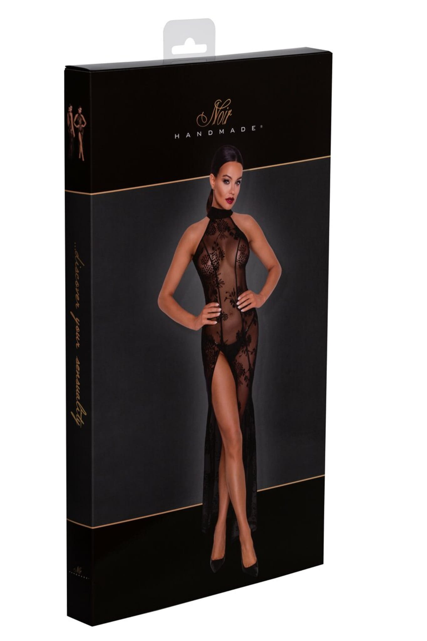 Przezroczysty materiał i miękki flok to doskonała mieszanka odwagi i delikatności. Zaprojektowana górna część sukienki podkreśla smukłą sylwetkę, która płynnie przechodzi w długą, kokieteryjną spódnicę z wysokim rozcięciem na udzie, dodając odrobinę zmysłowości.