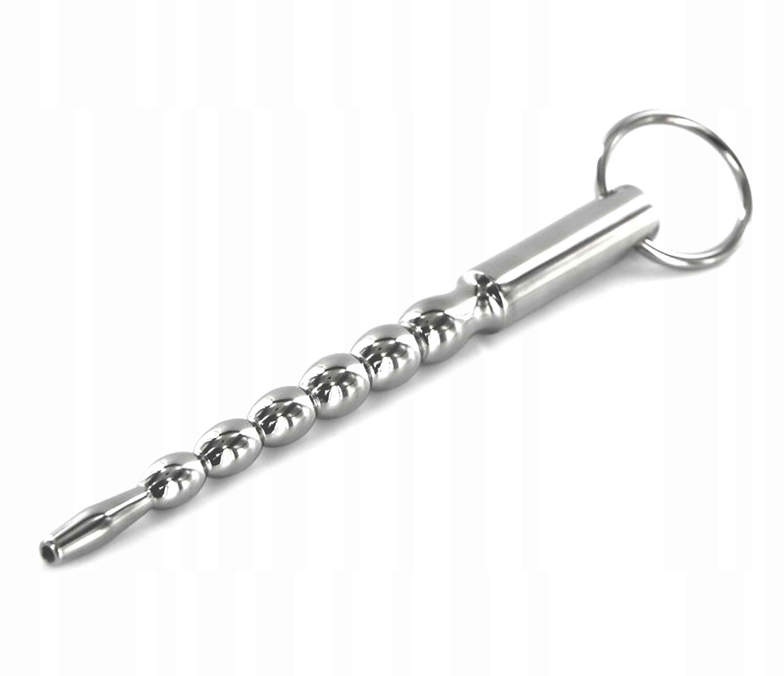 Dilator jest pusty na całej długości. Wykonany z pięknej, wysokiej jakości stali nierdzewnej. Bardzo łatwy w użyciu i czyszczeniu. Posiada 6 kulek, od małych do dużych. Koniec, w którym wkładasz dilator do cewki, ma średnicę 8 mm, a najszerszy punkt ma 12 mm. Pręt ma długość 140 mm, a część wkładana ma długość 102 mm. Dla bezpieczeństwa przymocowany jest pierścień, który zapewnia również ekscytujący wygląd piercingu.