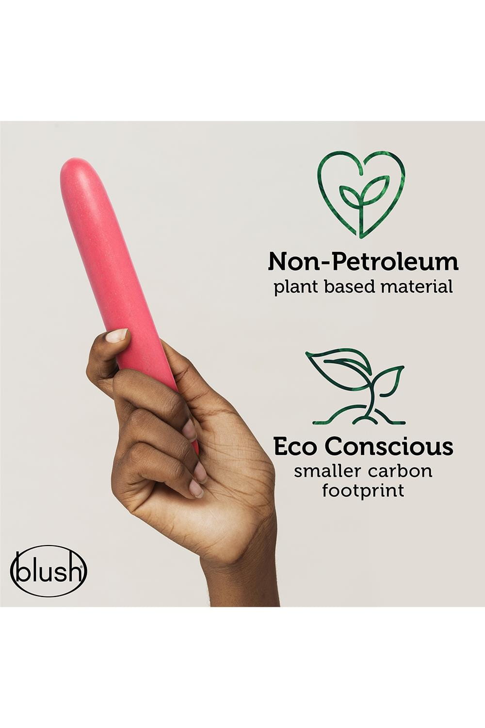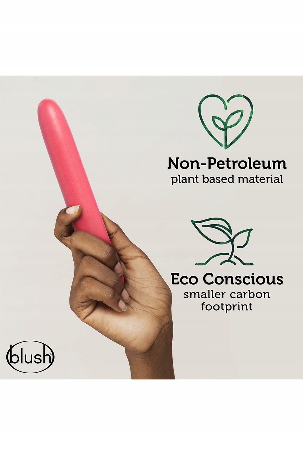 Blush BioFeel TM jest gładki w dotyku i wykonany w co najmniej 35% z zrównoważonej materii roślinnej niepochodzącej z ropy naftowej (pszenicy). Inni producenci używają plastiku w 100% na bazie ropy naftowej.