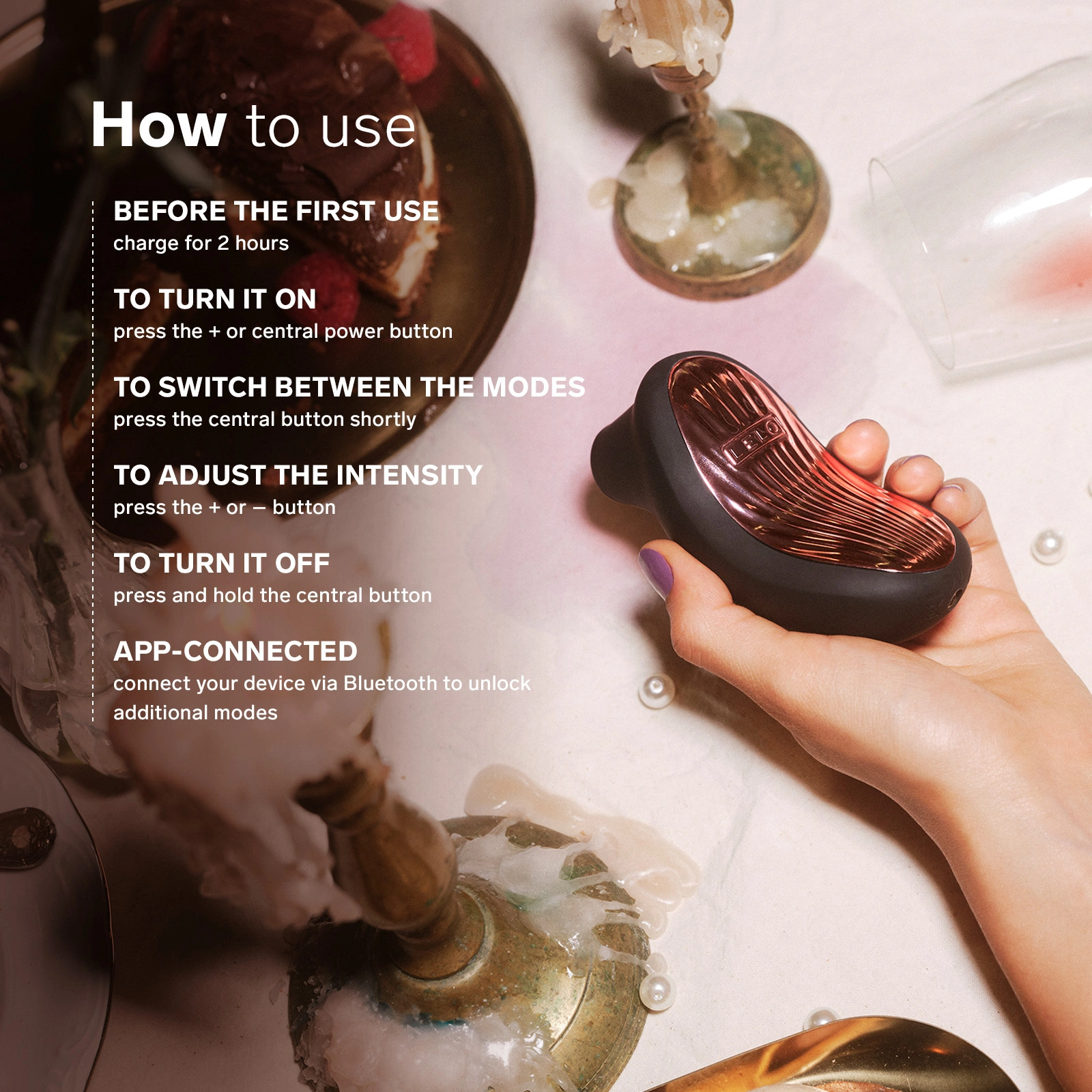- Po połączeniu z aplikacją LELO™ (Bluetooth) odblokowujesz 2 ekstra tryby: • FINISH ME OFF – perfekcyjnie narastający do finału • OUT OF CONTROL – chaotyczny, nieprzewidywalny i totalnie szalony rollercoaster wrażeń.