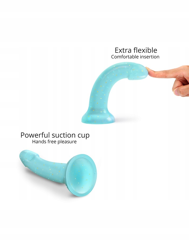 Dildo ma samoprzylepną przyssawkę, dzięki czemu można go przymocować do dowolnej gładkiej, twardej powierzchni i korzystać z niego bez użycia rąk.