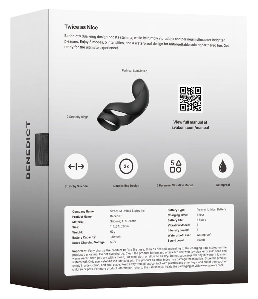 Benedict firmy Svakom to pierścień łączący penisa i jądra z anatomicznie idealnie ukształtowanym wibratorem krocza, który ściśle przylega do skóry. Wysoka rozciągliwość i elastyczność zapewniają optymalne dopasowanie i bardzo przyjemny komfort noszenia. Ponadto, ekscytująco mocne dopasowanie skutecznie podtrzymuje erekcję, zapewniając długotrwałą wydajność podczas uprawiania miłości. W tym samym czasie głębokie wibracje wibratora krocza niestrudzenie pieszczą krocze pomiędzy odbytem a moszną, zapewniając intensywne szczytowanie!