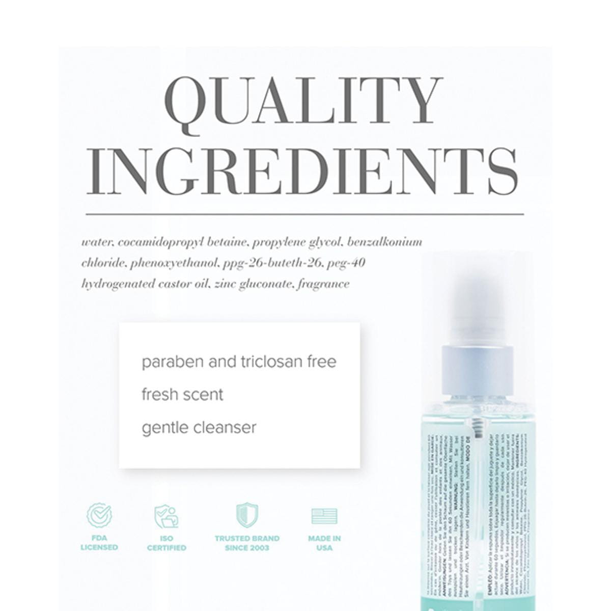 Ingredients: Water, Cocamidopropyl Betaine, Propylene Glycol, Benzalkonium Chloride, Phenoxyethanol, PPG-26-Buteth-26, PEG-40 Hydrogenated Castor Oil, Zinc Gluconate, Fragrance