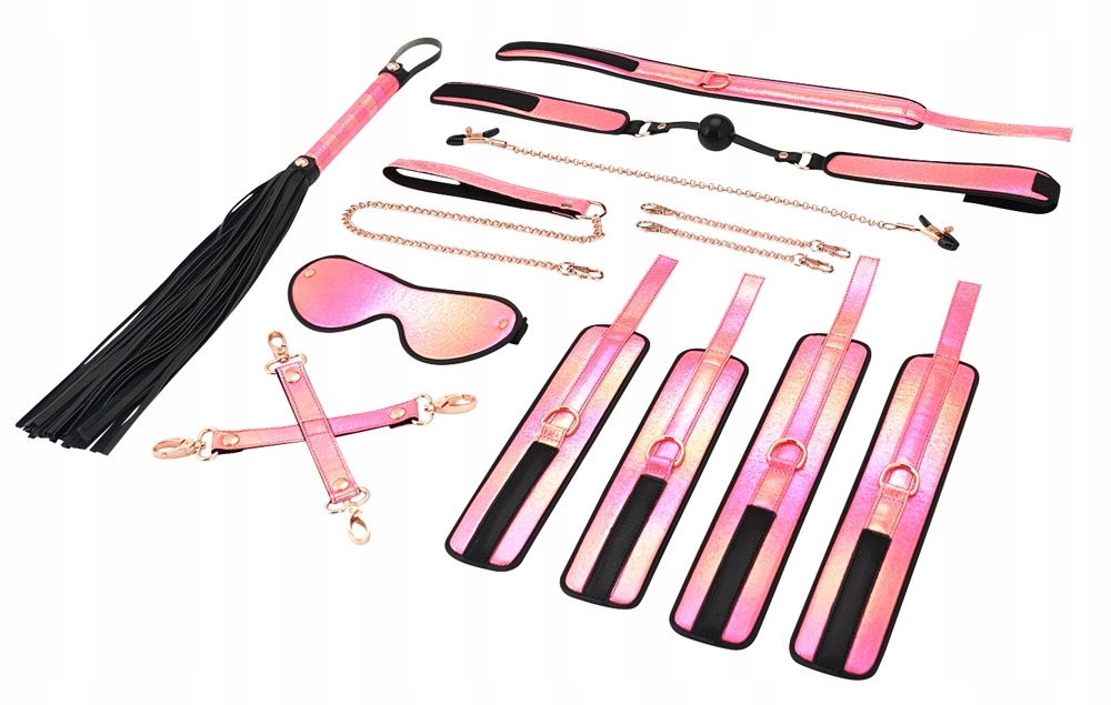 8-częściowy zestaw do bondage Vivid Sakura marki Liebe Seele o wyrafinowanym perłowym wyglądzie (błyszczący róż) ze złotymi okuciami i akcesoriami. Wyjątkowy zestaw dla ciekawskich i koneserów - ekskluzywny i najwyższej jakości!