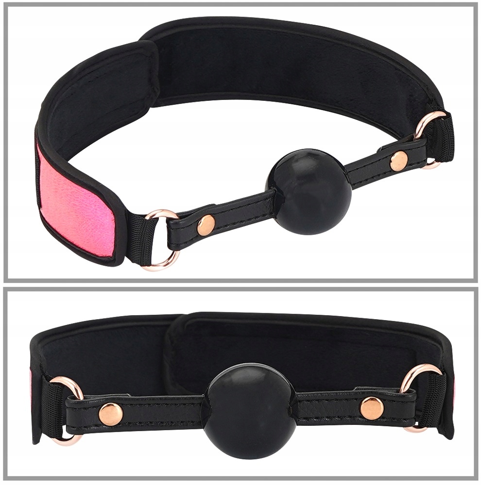 Kajdanki na szyję, ręce i kostki oraz pasek na głowę knebla są lekko wyściełane i można je szybko założyć i zdjąć za pomocą zapięć na rzepy i dopasować do siebie.
