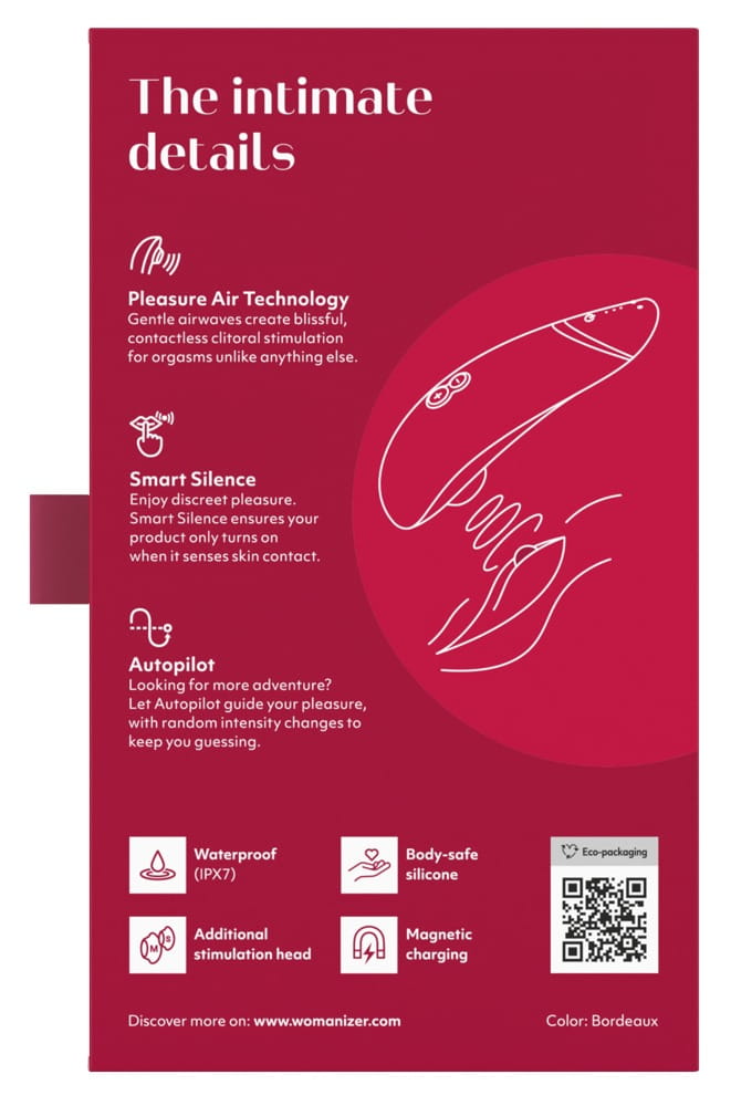 Dzięki funkcji Smart Silence Womanizer Premium 2 uruchamia się dopiero w kontakcie ze skórą – do tego momentu pozostaje w niemal bezgłośnym trybie czuwania. Urządzenie wyłącza się automatycznie po 5-10 minutach braku użycia (w zależności od poziomu naładowania baterii) – funkcję tę można łatwo ominąć, np. naciskając przycisk intensywności lub funkcję autopilota.