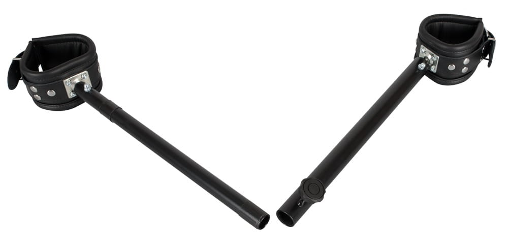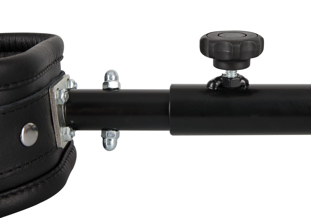 Bezpiecznie zamocowane miękko wyściełane skórzane mankiety na regulowanym metalowym drążku (rozciągany od 35 do 60 cm).